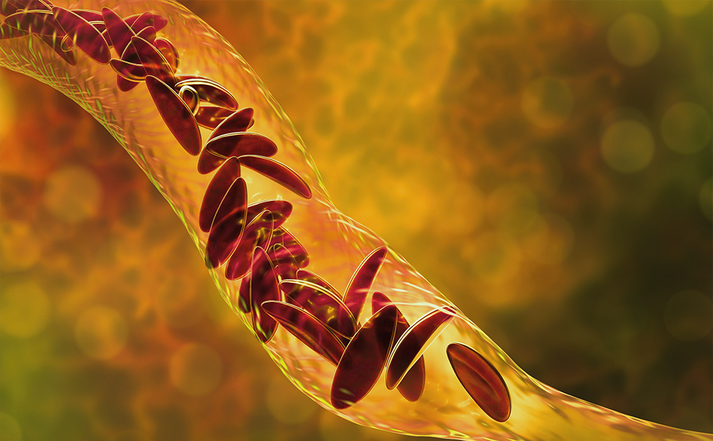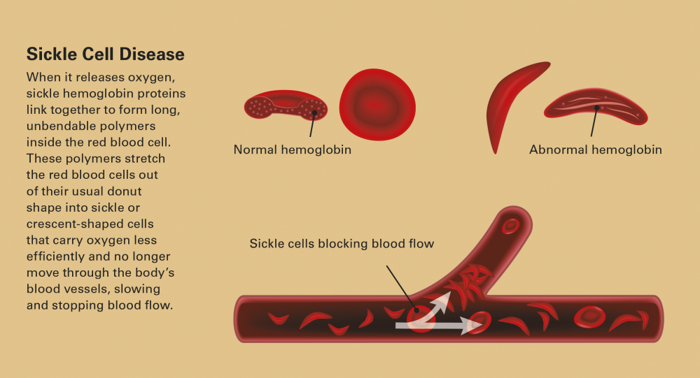 In sickle cell disease, a genetic variation results abnormal hemoglobin which cannot carry oxygen as well as regular hemoglobin. These sickle or crescent-shaped cells no longer move through the body’s blood vessels, slowing and stopping blood flow.