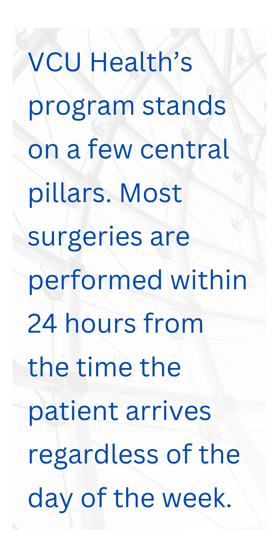 VCU Health’s program stands on a few central pillars. Most surgeries are performed within 24 hours from the time the patient arrives, regardless of the day of the week, and the surgeries constitute “single-shot” procedures, meaning they’re done right the first time, Dr. Kates said. Another pillar is that patients can begin to walk nearly immediately after the surgery and bearing full weight.