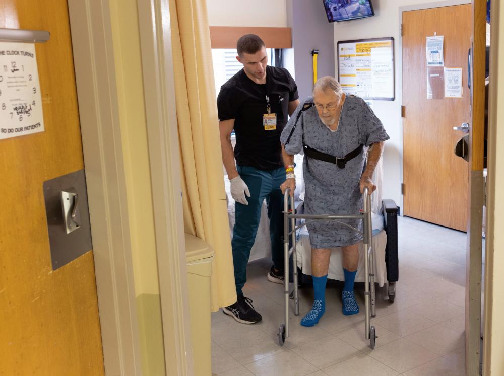 “My family and these people,” he said, choking up as he gestured around his hospital room, “I love them to death.” Nearby was Joshua Stallings, D.P.T., who worked with Marsh in the days after surgery, including initially helping him move from his bed to his room chair postsurgery so Marsh could begin his physical therapy.