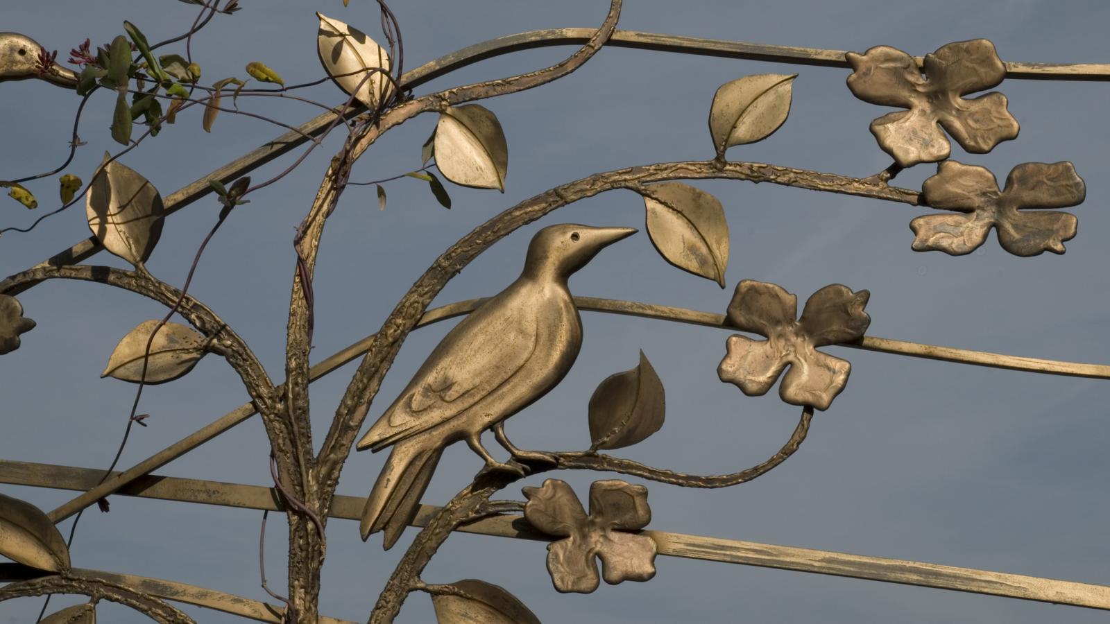 This photo features metalwork details of a bird illuminated during the golden hour at VCU Massey Comprehensive Cancer Center. Part of the healing garden called “Becky’s Garden,” the scenery surrounds a beautiful space for patients and care providers to enjoy respite from the stress and stimulation of a clinical environment. Photo: Tom Kojcsich, VCU