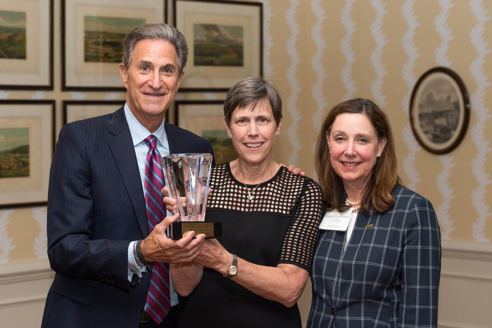 Jean Giddens, Ph.D., RN, FAAN (center), dean of the VCU School of Nursing, received the Robert Irby Award for her outstanding work with major fundraising efforts on the MCV Campus. She is thanked by Harry Thalhimer, MCV Foundation board chair, and Margaret Ann Bollmeier, MCV Foundation president.