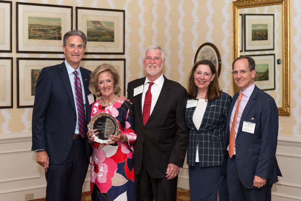 Gail Johnson, a former chair and current Lifetime Honorary Trustee of the MCV Foundation Board of Trustees, displays her Eugene P. Trani Award, which she received in recognition of her exceptional dedication and support of the MCV Campus. Harry Thalhimer, Earl Johnson, Margaret Ann Bollmeier and MCV Foundation Chair-Elect Wyatt Beazley IV congratulate her.