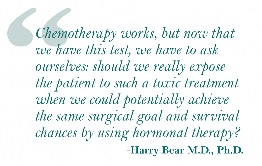 “Chemotherapy has been used neoadjuvantly (pre-surgically) to treat breast cancer for decades in order to shrink tumors and enable breast-conserving surgery,” said Dr. Bear. “However, neoadjuvant hormone therapy is markedly underutilized in the U.S. and more commonly used in Europe. Chemotherapy works, but now that we have this test, we have to ask ourselves: should we really expose the patient to such a toxic treatment when we could potentially achieve the same surgical goal and survival chances by using hormonal therapy?”