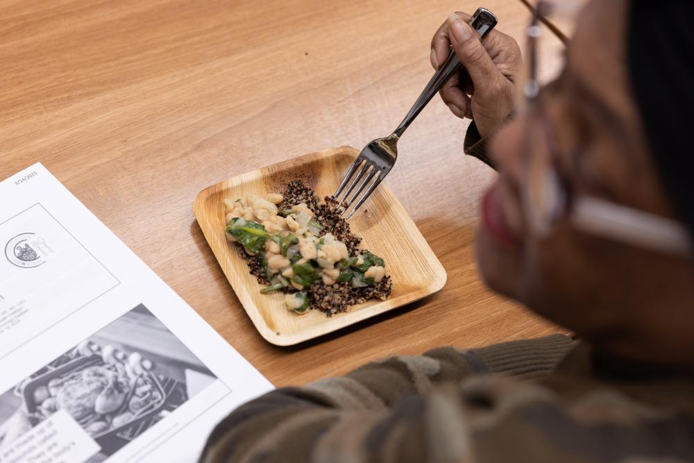 As she talked about tofu’s benefits as a plant-based source of protein and how its neutral flavor easily absorbs sauces of any kind, she watched about a dozen people size up the dishes in front of them. Some dove in eagerly while others picked gingerly at a bell pepper or piece of broccoli.