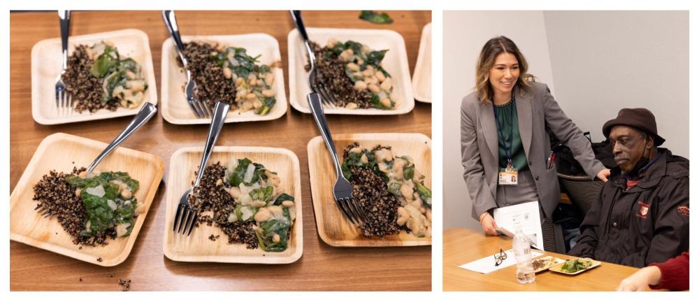 Samantha Haswell, R.D., a Massey integrative health dietitian and outpatient oncology dietitian, leads a Food is Medicine nutrition and cooking class on protein as participants sample a recipe.