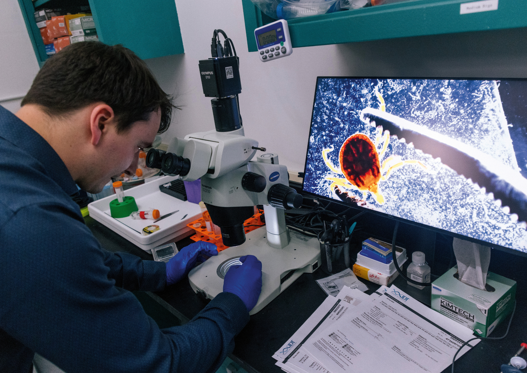 Tucked toward the back of a VCU School of Medicine research building, through a laboratory, around a couple of tight corners, just past pieces of equipment that accomplish tasks like “fast protein liquid chromatography,” there is a door. It’s nondescript, save for a small, lime-green, handwritten sign that reads: TICK ROOM.
