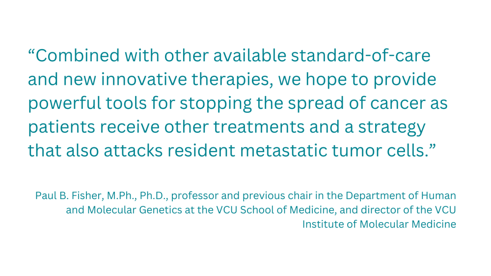 “Our interest and focus over the years have been to comprehend and define ways to attack metastases,” said Paul B. Fisher, M.Ph., Ph.D., professor and previous chair in the Department of Human and Molecular Genetics at the VCU School of Medicine. “Achieving success in this quest has potential to directly translate into therapies for multiple types of advanced aggressive cancers.”