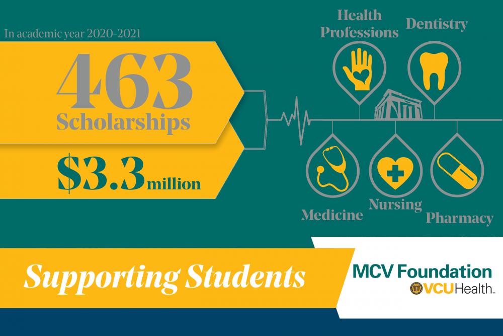 We are most grateful for the support of our faculty, alumni and friends who make it possible for the MCV Foundation to award hundreds of scholarships each year. Such generosity supports the schools and college on the MCV Campus in their efforts to recruit and retain today’s most promising students – students who contribute to the vitality of the classroom and are most likely to become tomorrow’s preeminent medical professionals, dedicated educators and civic leaders.